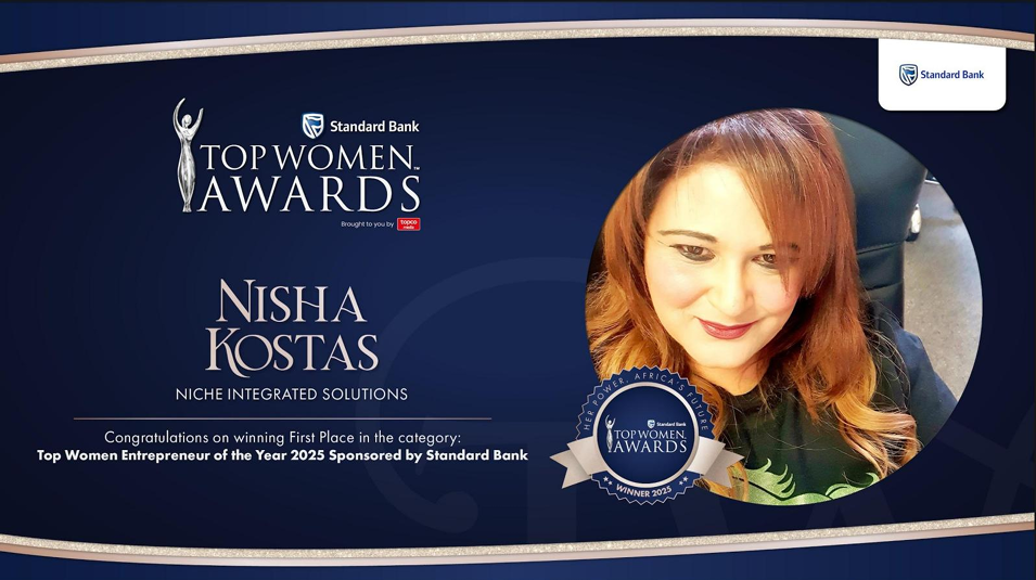 Pretoria, South Africa – 02 December 2025 — Nisha Kostas, Chief Executive Officer of Niche Integrated Solutions (Niche Integrated), has been named Top Business Entrepreneur of the Year at the prestigious Standard Bank Top Women Awards, a national accolade that celebrates outstanding female entrepreneurs who lead with excellence, innovation and integrity.